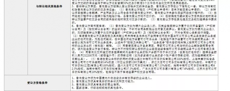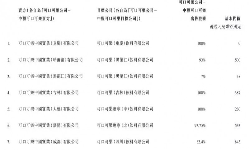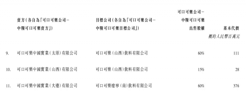 二是由中国食品可口可乐合资公司旗下一家附属公司向可口可乐旗下附属公司收购其于多家在中国内地多个区域从事前述业务的公司的股本权益及。
