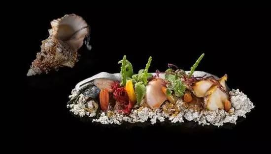 菜品包括三文鱼棒棒糖、蜗牛粥以及他的代表菜“海洋之声”,将海鲜、海草以及塞进海螺的iPod一起放入盘中。