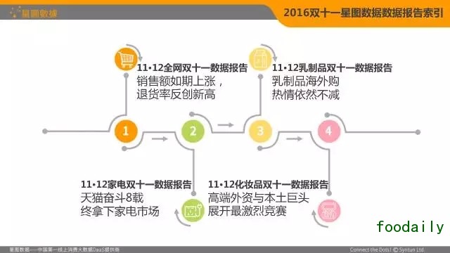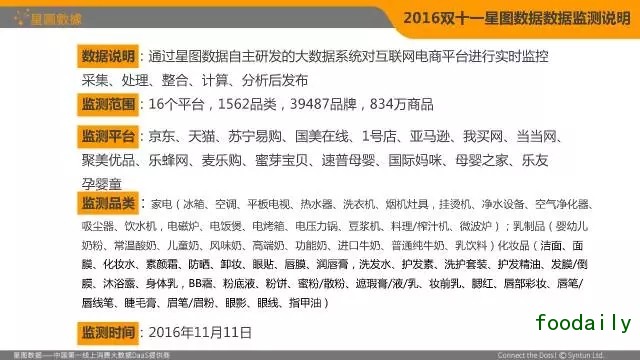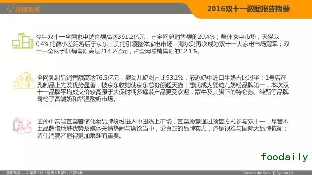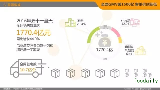 那么,今年的双11,天猫、京东、1号店、苏宁易购等电商平台,谁是婴幼儿奶粉销量第一?全网奶粉、进口牛奶、高端奶和常温酸奶冠军又分别是谁?在揭开上述谜底之前,首先让我们来了解一下2016年全网双11销售的大数据(点击图片可查看大图,往右滑动可顺序观看,横屏效果更佳)。
