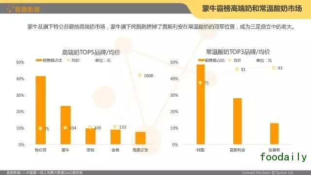 2016年双11,全网乳制品销售额高达76.5亿元,婴幼儿奶粉占比93.1%,液态奶中进口奶占比过半;1号店在乳制品上先发优势显著,被京东收购使京东总份额超天猫;惠氏成为婴幼儿奶粉品牌第一;本次双11平均成交价较高,源于大促时期多罐装产品更瘦欢迎;蒙牛及旗下的特仑苏、纯甄等品牌霸占了高端奶和常温酸奶销售排行榜首。
