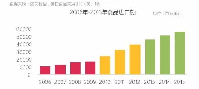 2010年后,食品进口额加速增长,根本原因是人均可支配收入提高和日益增长的进口品消费需求;据美国食品工业协会预测:2018年中国将成为最大进口食品消费国,市场规模将高达4800亿元。