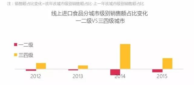 以线上食品销售总体为参照,进口食品更受一二级城市中青年喜爱。