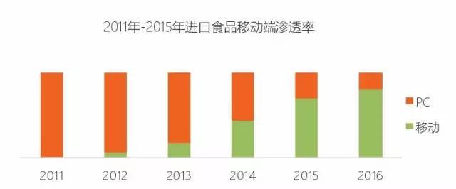 虽然一二线级城市进口食品销售量占比远高于三四线级城市,但三四线城市受限于线下渠道,线上增速更快。进口食品移动端渗透率增长迅速,三四级城市移动端中青年成为重点开发群体。