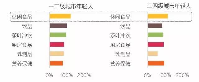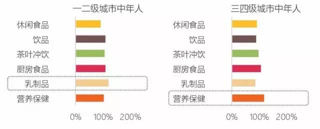对于年轻消费者,无论来自一二级城市还是三四级城市都更加青睐休闲食品;对于中年消费者普遍对健康更加关注,一二级城市消费者更多地购买进口乳制品保持健康,三四级城市消费者更多地购买营养保健品。
