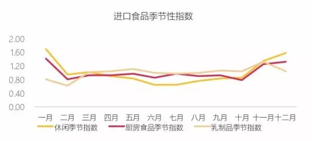食品销售受季节和节日影响很强,往往年后进入淡季,9、10月走入旺季并在年底迎来高峰。其既包括市场因素,比如坚果类作为年货非常合适;又包括供应链因素,比如巧克力易融化,在夏季不宜储存运输。线上休闲食品季节性尤为突出,能在旺季爆发拉动全年销售,而从销售走势看,进口休闲食品增长也主要来自旺季。(注:以2011-2015线上销售计算季节性指数,剔除增长趋势影响)