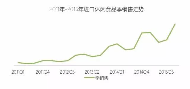 进口休闲食品2012年-2015年平均年增长率超过80%,可分解为三个方面:1.销售旺季拉动;2.亮点品类增长;3.关键客群带动。