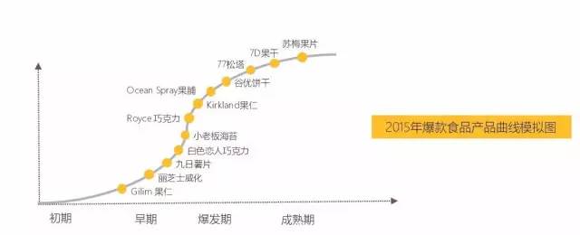2015年白色恋人巧克力销售出现爆发性增长。我们将与白色恋人走势类似,在2015年之前就崭露头角,在2015年销售提速增长的爆款产品定位阶段的爆发期爆款。