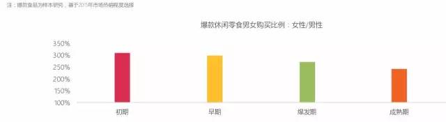 爆款休闲零食主要购买者为女性,尤其在产品初期和早期,进入爆发期和成熟期后接受范围增广,男女比例差异缩小,说明女性对休闲食品流行关注度远高于男性。