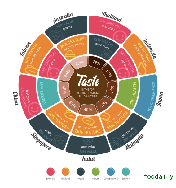但是除了泰国,其他国家中只有46%的消费者优先考虑口味。