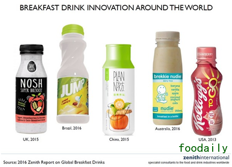 Zenith公司指出,早餐饮品是一种代替传统早餐、便捷液态的营养补充食品,代表产品是把谷物与牛奶相结合的瓶装饮料。