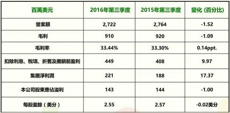 营收:2016年第三季度收益达到2.4亿元,同比衰退4.06%,占本集团总收益1.28%
