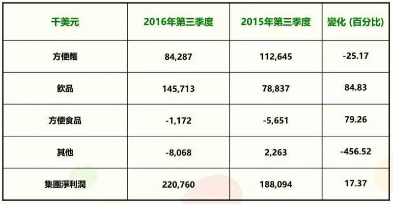 得益于方便食品事业的生产模式精进及原物料价格下跌,毛利率较去年同期上升至37.02%。康师傅称,本集团优化供应链佈局,严格管控各项费用,令2016年第三季度整体亏损缩减至1,172千美元亏损,同比改善79.26%。