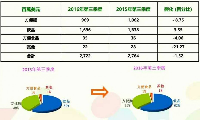其中,三季度饮料业务是亮点,另一方面方便面业务跌幅收窄。三季度方便面销售额同比下降8.8%,二季度下滑11.6%;三季度饮品销售额增长3.6%,二季度下滑21.1%。
