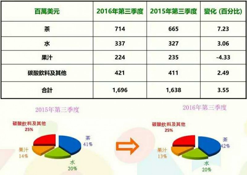 康师傅指出,根据尼尔森数据显示,2016年第三季度中国饮料行业销售量与销额同比分别增长4.6%及5.4%,涨幅均优于第二季度。第三季度康师傅即饮茶(包含奶茶)销售量市占达54.2%,稳居市场首位。包装水2016年第三季度销售量市占达16.2%,暂居市场第三,市占较第二季提升;果汁饮料凭借康师傅旗下果汁品牌及百事纯果乐品牌,第三季度销量市占为19.2%,仍居市场第二。