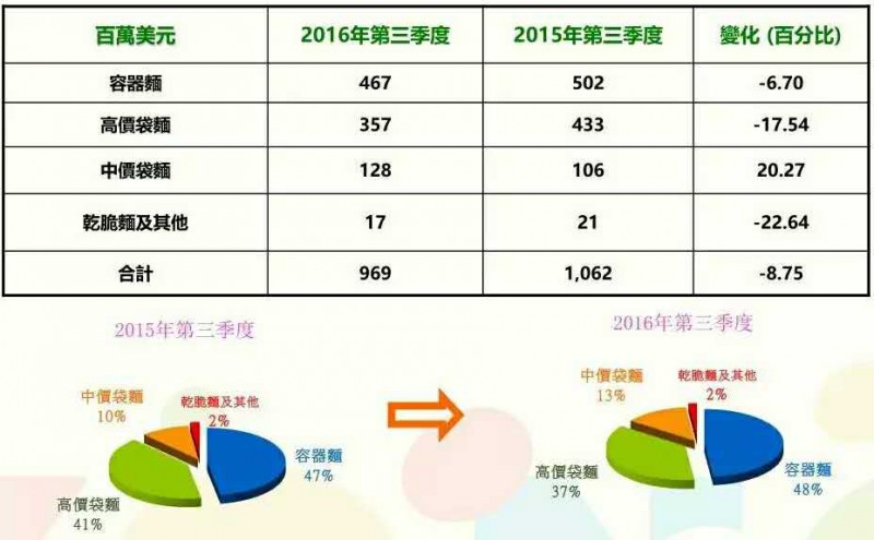 根据尼尔森最新数据显示,2016年第三季度方便面整体市场销量衰退5.4%,销额成长2.3%。第三季度康师傅方便面销量及销额市占分别为42.5%及50.0%,维持市场领先地位。