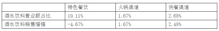 根据数据统计,在特色餐饮渠道,酒水饮料的营业额占比达到10.11%,是大众餐饮中销售占比较高的渠道,但同比增幅却为-4.65%。在火锅渠道,酒水饮料的营业额占比为1.67%,同比增幅为1.67%。而在快餐渠道,酒水饮料的营业额占比为2.68%,其中涨幅最快,达到了2.48%。