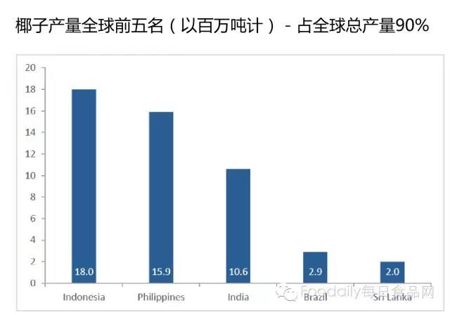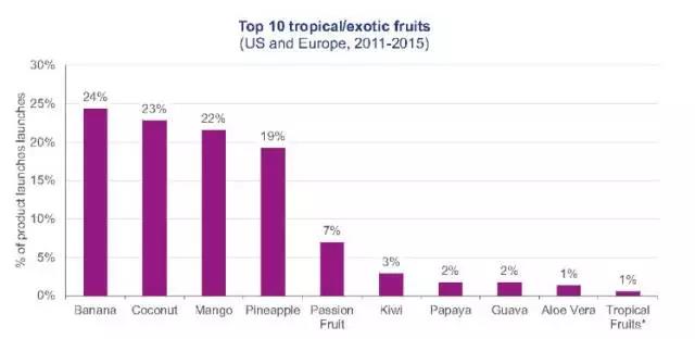 作为最具代表的热带海滩水果,椰子凭借其独特的异国情调风味,而成为快速增长的水果原料之一。根据Innova的报告,2011-2015年,美国和欧洲地区所有上市新产品中,含有热带水果的食品饮料增长了18%;其中香蕉排名第1,成为最受追捧的水果原料,占有24%的市场;其次为椰子,占23%;另外还有芒果、菠萝、百香果等。