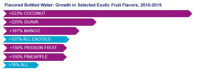 而在瓶装风味水领域,由于椰子水市场的火热膨胀,以及随之而来的椰子风味在整个食品饮料行业的发展带动,2015年椰子风味的瓶装水实现了533%的增长(与2011相比)。其次是,番石榴、芒果、百香果、菠萝等风味,也受到行业的热切关注。