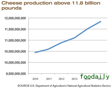 《美国农业部全国农业数据指南》指出,2010年全美奶酪产量为104亿磅,2015年增至118亿磅。