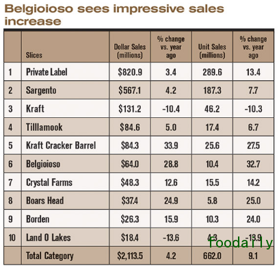 截止到2016年9月4日的52周内,美国各类切片奶酪品牌销售数据。——Information Resources Inc. (IRI)。