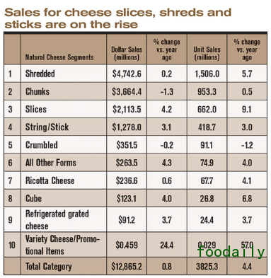 Information Resources公司报道称,截止至2016年9月4日,在过去的52周内,天然奶酪的销售额增加了0.8%,达到128亿美元,单位产品销售量增加了4.4%,达到38亿。与之相反,加工奶酪的销售额仅29亿美元,下降了5.3%,单位产品销售量也下降了6.3%(详见上表)。