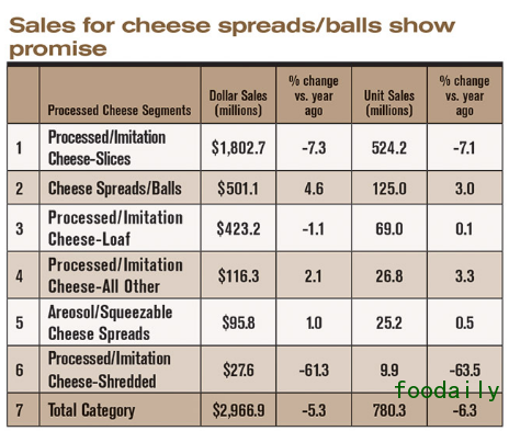 卡夫亨氏旗下品牌Velveeta以便携性为导向,推出了全新5包4盎司独立包装的奶酪,每份含有70卡路里和4g脂肪。Schuman Cheese公司推出了Yellow Door Creamery特色奶酪产品,该奶酪不含生长激素,有5盎司和2盎司两种包装形式可供选择。