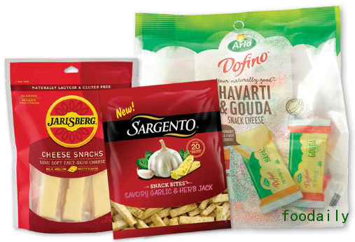 芝加哥Dutch Farms公司的Cracker Cuts奶酪采用可重复密封的包装,每份10盎司,含有20小片奶酪,包括Sharp Cheddar、Marble Jack 和Pepper Jack三种口味。威斯康辛州BelGioioso Cheese公司推出了小分量的意大利果仁羊奶奶酪和马苏里拉奶酪,每包8小袋,每袋0.75盎司(含有70卡路里),包含3片奶酪。