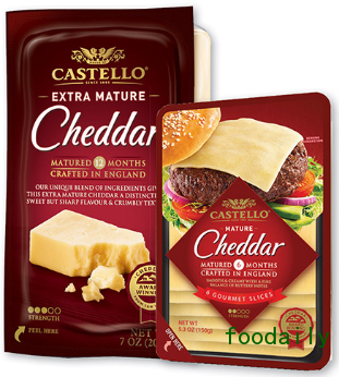 Arla Foods公司旗下Castello品牌近期在美国首次推出了Cheddar奶酪系列产品——Extra Mature Cheddar 奶酪块和奶酪片,有甜味和咸味可供选择。