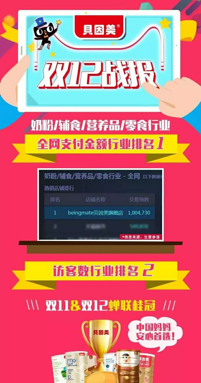 12月12日晚24点,2016年最后一个消费者狂欢日落下帷幕,妈妈们也抓紧着最后的机会,肆意为宝宝囤积放心口粮。在2016“双12”电商大促中,贝因美奶粉销量荣摘全网奶粉类目桂冠。这也是贝因美奶粉继2016年双11后的再度夺冠。