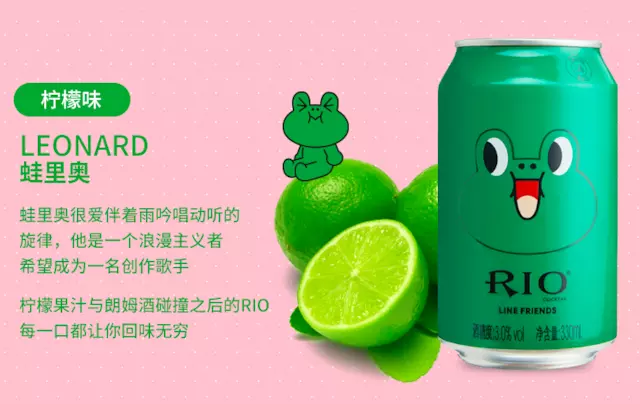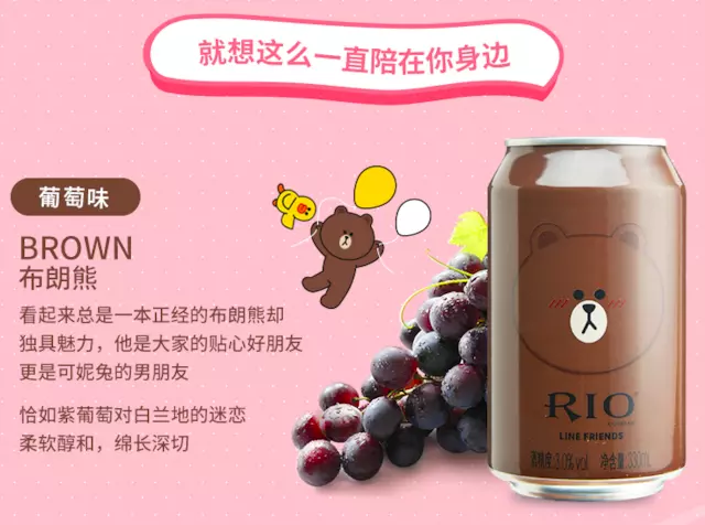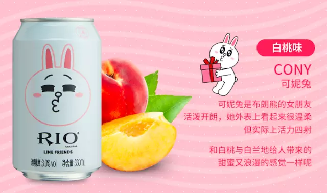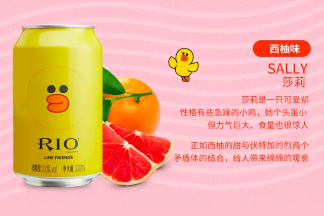 这是 12 月 17 日起,预调鸡尾酒品牌 RIO 和 Line 形象合作推出的新包装,目前主要在天猫和京东有售。