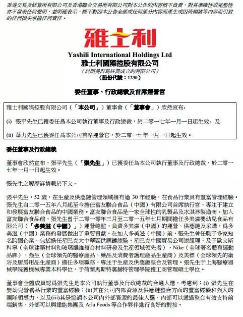 在本次任命前,张平是雅士利的非执行董事、审核委员会成员;在2014年5月加入雅士利前,他担任内蒙蒙牛分管财务方面的副总裁。