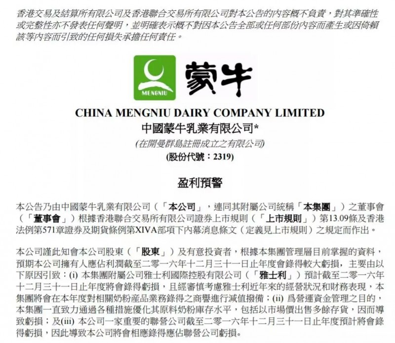 今天早间,在港上市的蒙牛乳业(02319.HK)发出了盈利预警公告。倒不是因为蒙牛本身的销情突然发生了什么问题,而是该公司对其投资的奶粉生产商雅士(01230.HK)产生的商誉进行减值。