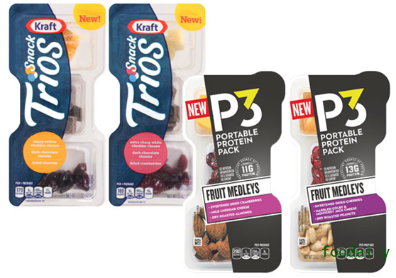 卡夫亨氏公司计划在2017年初推出全新的“卡夫三种零食组合”,以盘装的形式,每盘1.5盎司。就像产品名字所说,每个盘子有三个隔室。其中一个是奶酪块。另外两个包括巧克力块、水果干或格兰诺拉麦片。另外,公司还在努力扩张旗下“P3”产品的种类,加入混合水果。这款产品也是用三隔室托盘的包装形式。全新的组合包括奶酪块、水果干、腌坚果。