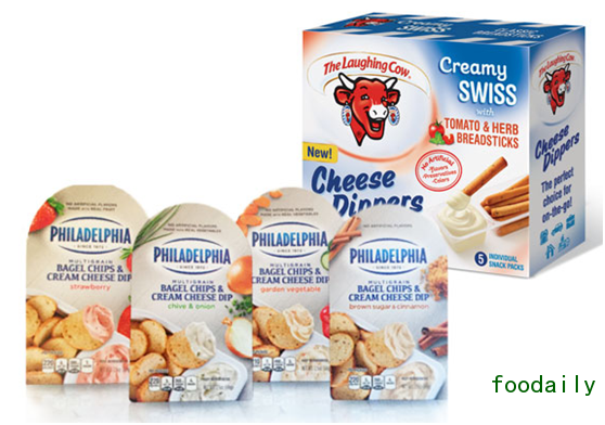 Bel Brands USA公司推出了“The Laughing Cow Cheese Dippers”。这款货架期稳定的零食包括两个品种,都含有公司原创的“Creamy Swiss”可涂抹奶酪。产品中还包含面包棒,有经典味、番茄味、草药等口味。2017年年初,卡夫亨氏公司将会推出Philadelphia全谷物百吉饼脆片和奶油奶酪酱零食。这款2.5盎司双隔间包装的产品包括红糖肉桂风味、香葱洋葱风味、田园时蔬风味、草莓风味,都作为蘸酱食用。
