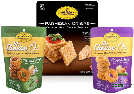 由Sonoma公司生产的新产品“Sonoma Creamery(培根奶酪脆片)”,将切达奶酪和无谷蛋白认证的有机藜麦、有机糙米、有机燕麦麸组合在一起,带来这款焙烤脆片产品。培根切达将切达和意大利去脂干酪组合在一起。所有的三个品种都包含圆片状和方形奶酪脆片,让这款产品成为一款多样化的零食、蛋糕配料、蘸料。在这款奶酪脆片问世之前,“Mr. Cheese O’s”已经获得了非常大的成功。这款产品的口味有奶酪、法国洋葱、意大利去脂干酪、甜辣椒、Tuscan草药、热情BBQ等。
