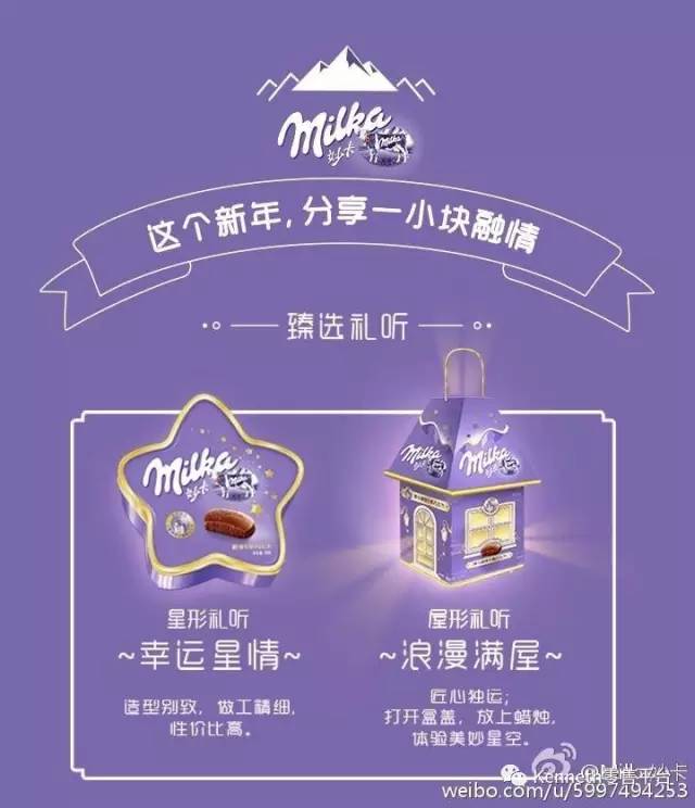 除了奶牛挂上了圣诞的大蝴蝶结,其实有两款SKU也是为了迎接节日而推出的产品。有别于国内其他品牌比较“土豪”+“送礼”的定位,Milka还是有很强的分享定位,而这些礼听也是偏小清新+文艺范的感觉。