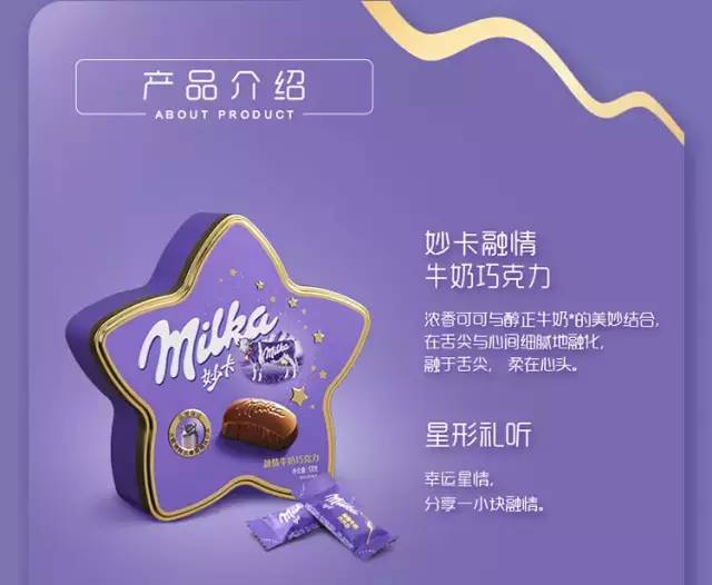 Milka作为一个百年老牌,在进入中国的时候,除了在口味上作了一些调整(更适合本地的甜度,但也不失巧克力的融情),其标准性的紫色也一起带入中国。