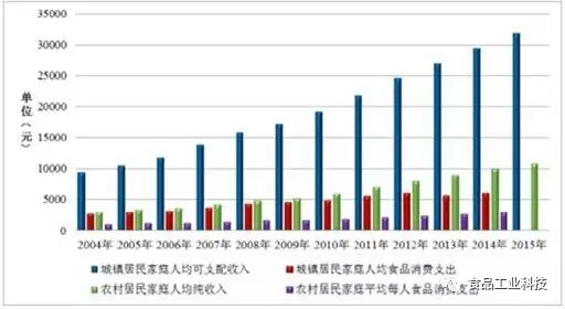 随着我国的经济不断快速发展,我国城乡居民收入也有了巨大的提升,食品方面的支出保持稳定增长的态势。2004年到2015年,我国居民收入、食品消费的情况及增长趋势如下: