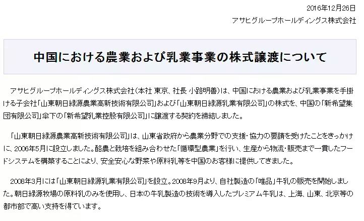 朝日集团表示,这次要出售的两家公司均位于山东省,分别是山东朝日绿源农业高新技术有限公司和山东朝日绿源乳业有限公司,出售对象则是新希望集团旗下的新希望乳业控股公司。