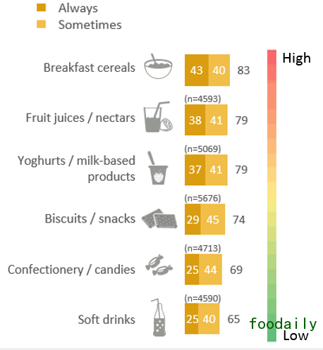 对配料的特殊关注取决于所购买产品的类型:放纵产品与为了维持健康饮食而消费的产品。消费者倾向于对在决定购买时使用不同的选择标准,并且在购买日常食物方面更加挑剔。(例如,与其他必需食品相比,对软饮料的配料关注度明显较低)。