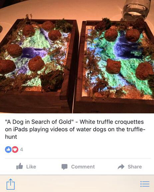 这道菜由美国旧金山一家米其林三星餐厅Quince推出,主要用白松露肉饼制成。经过摆盘,和iPad加持,这道菜呈现出一只狗狗在水里寻找松露的视觉效果。正如菜名所示“A Dog In Search Of Gold(一只找寻金子的狗)”。
