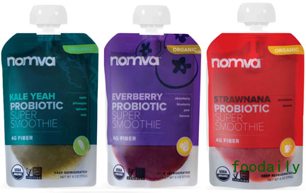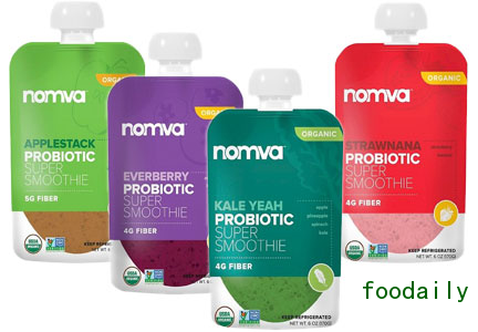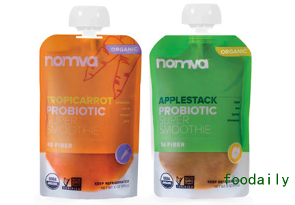 Nomva有机奶昔通过高压过程包装在透明袋子里,有草莓香蕉、热带风情(凤梨、胡萝卜、梨和芒果)和甘蓝混合(苹果、凤梨、菠菜和羽衣甘蓝)等口味。