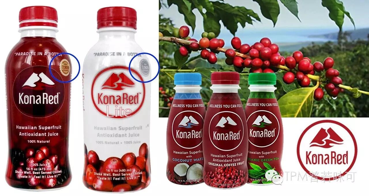 很多人并不知道咖啡豆其实就是咖啡浆果的种子,咖啡浆果其实具有很强的抗氧化功效。最近几年,以咖啡浆果为原料的各类产品发展势头强劲。来自美国的KonaRed就是一个做夏威夷可纳咖啡浆果果汁的品牌,其卖点就是咖啡浆果的抗氧化性和给机体提供能量的特性,每瓶ORAC为7909 µmol /480ml。