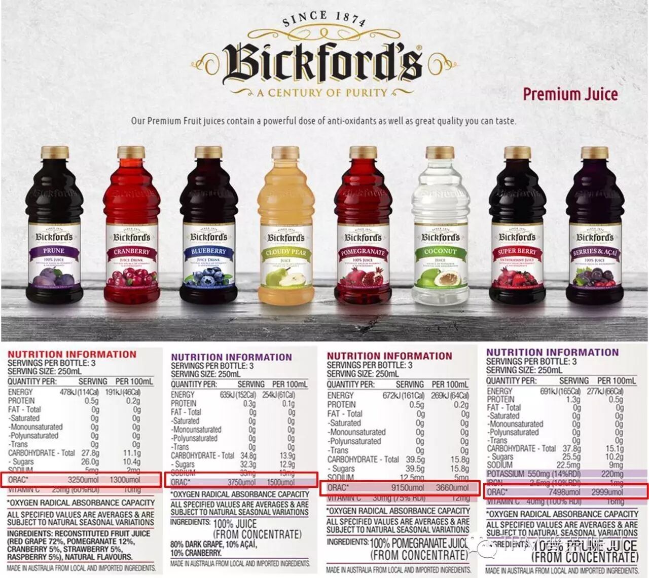 Bickford's 是来自澳大利亚的果汁品牌,推出的高端果汁系列是百分百果汁,各种超级水果风味,如西梅、蔓越莓、蓝莓、石榴、巴西莓等,宣称天然高抗氧化。在营养配料表的标签上除了VC和各种矿物质含量外,我们还可以清晰的看到每款产品不同的ORAC值,其中最高的是石榴汁,每瓶ORAC为7498µmol /250ml,喝一瓶就能满足每日抗氧化所需了。
