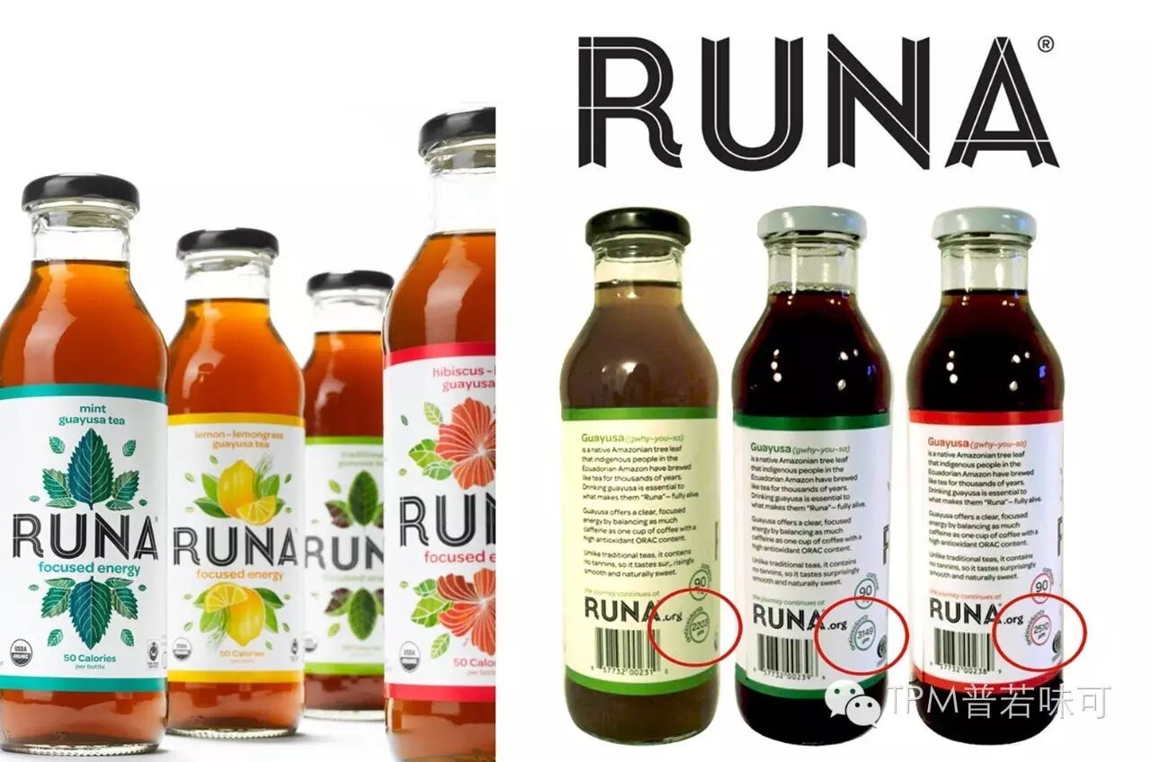 Runa是北美地区第一家销售Guayusa的饮料公司,Guayusa被誉为来自厄瓜多尔的“超级树叶”,煮出来的茶中咖啡因含量和咖啡差不多,抗氧化物的含量也是绿茶的两倍。Runa Guayusa Tea不含单宁酸,天然提神,高抗氧化,每瓶ORAC可达2000-3000 µmol /414ml。