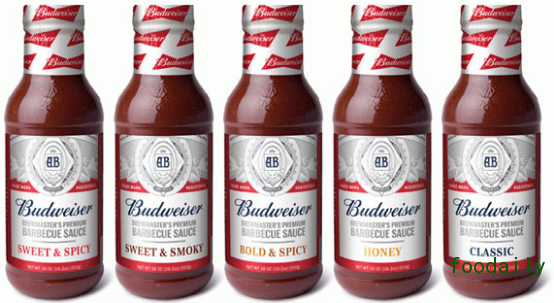 百威(Budweiser)和Fremont公司合作推出了全新的百威大师臻藏优质烤肉酱(Budweiser Brewmaster’s Premium Barbecue Sauces)。该系列产品使用了啤酒为原料,但并不含酒精,共有五种风味:甜辣味、烟熏甜味、浓郁辣味、蜂蜜味和经典原味。