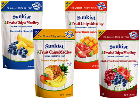 Snack It Forward公司的Sunkist系列推出了新品Sunkist Fruit Chips Medley。这些冻干水果零食不含添加糖、人工色素和人造香料,共有四个品种:香蕉-芒果-菠萝、蓝莓-草莓-樱桃、蓝莓-菠萝和草莓-芒果。