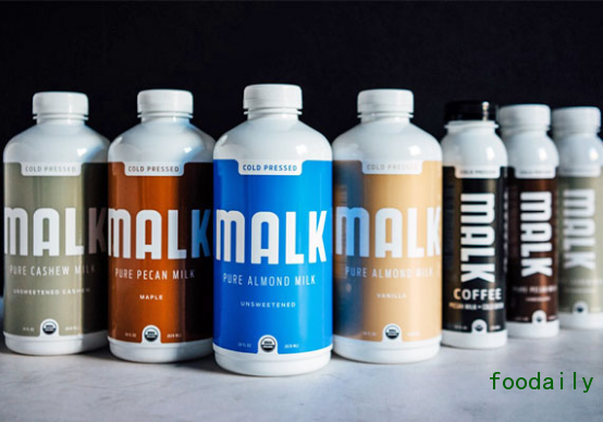 MALK Organics公司推出了一系列有机冷榨坚果牛奶。每款饮料含有至多7g糖,至少一杯发芽有机坚果,仅使用了3-5种有机原料。MALK产品共有七种口味:扁桃仁(Almond)、无糖扁桃仁(Unsweetened Almond)、山核桃(Pecan)、腰果(Cashew)、巧克力山核桃(Chocolate Pecan)、山核桃冰啤(Pecan Cold Brew)以及山核桃蛋酒(Pecan Nog)。