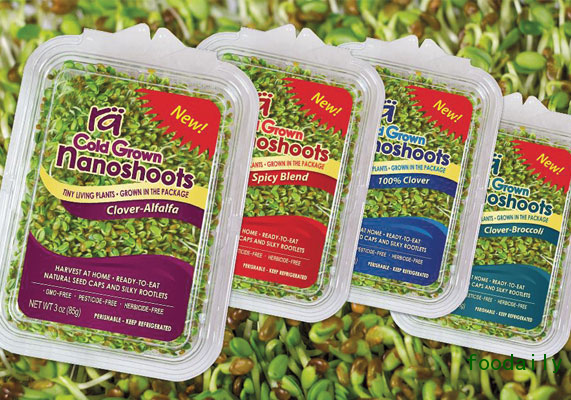 Rä食品股份有限公司推出了一款传统芽菜替代品——Cold Grown Rä Nanoshoots。这些细小的活体植物原封不动地在密封包装内低温生长。这一即食植物产品不含除草剂、杀虫剂和转基因成分,共有四个品种:三叶草、三叶草/苜蓿、三叶草/西兰花和三叶草/萝卜。