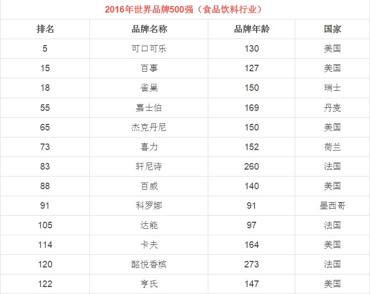选入《世界500强》的食品与饮料行业品牌中,美国品牌数量最多,共有15个,包括可口可乐、百事、箭牌等众多国际知名品牌,横跨饮料、休闲、速食等多个品类。